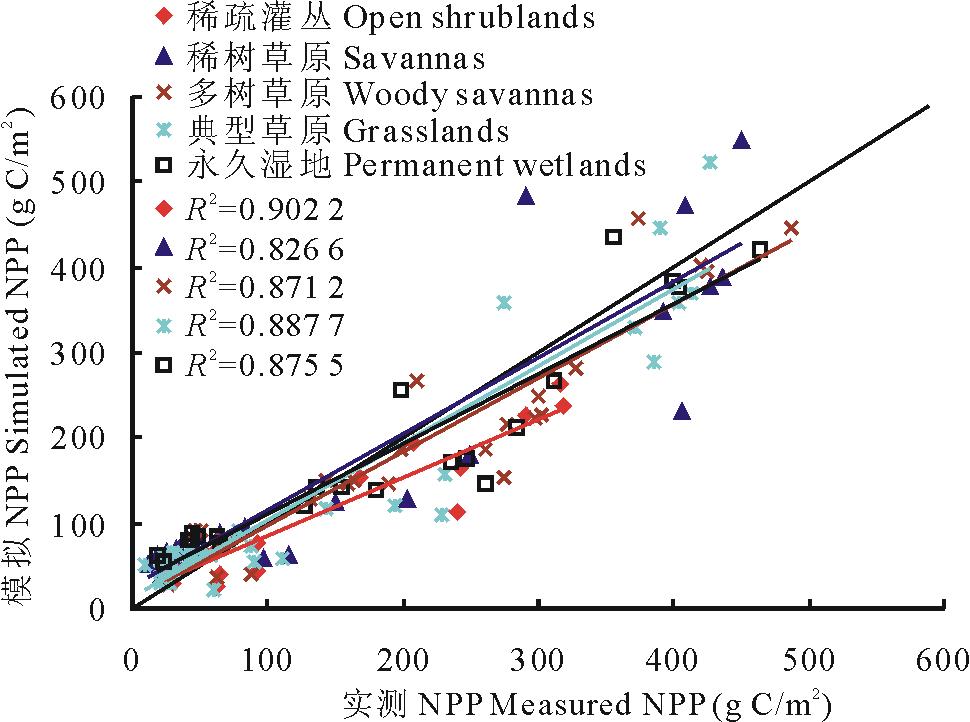 本研究利用2010年独立的南方草地NPP实测数据, 对遥感模型的模拟结果进行验证。结果表明, NPP的模拟值和实测值之间有很好的相关性, 5种草地类型R2分别为0.902 2, 0.826 6, 0.871 2, 0.887 7和0.875 5(P< 0.01), 均达到了极显著水平。模拟均方根误差RMSE分别为42.9, 67.7, 50.4, 46.1和48.8 g C/m2, 相对均方根差分别为0.385, 0.425, 0.237, 0.363和0.262, 均较小。上述结果说明南方草地NPP的遥感估算模型的模拟结果是可行的。另外从草地NPP模拟值与实测值的1∶ 1关系图(图3)可以看出, 模型的模拟结果与实测值之间趋势一致, 结果比较可靠。