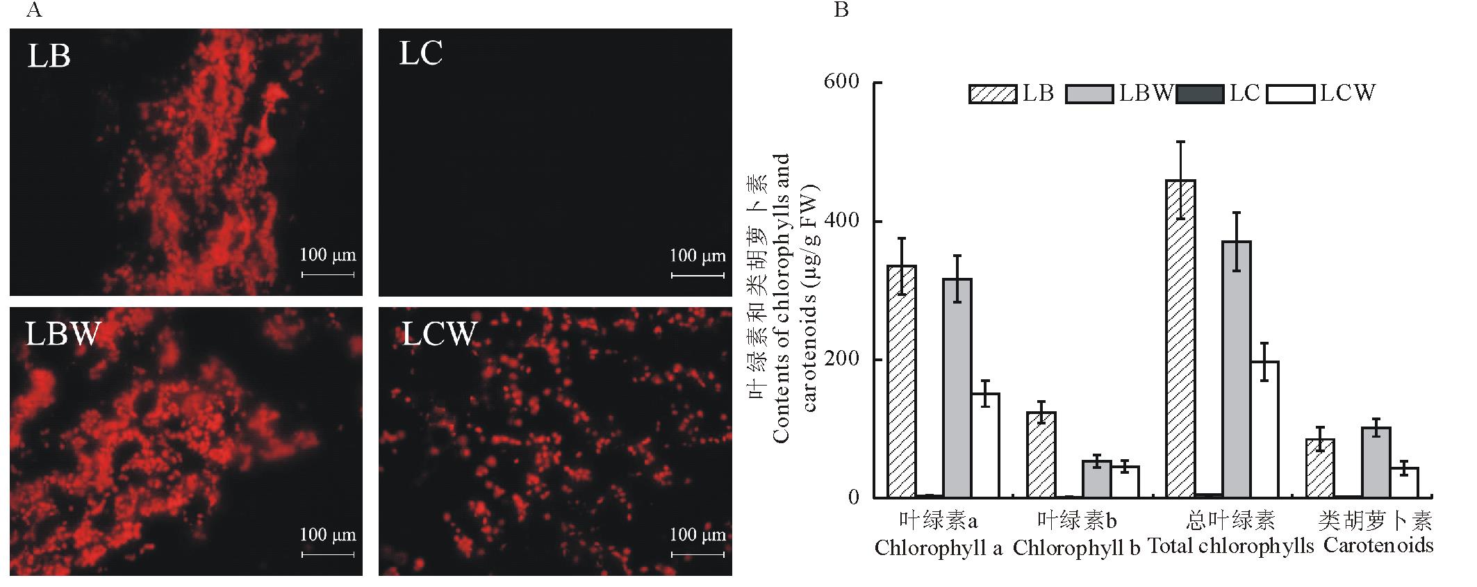叶绿素原位荧光检测, 分别采集金心吊兰及其野生型全绿吊兰叶片的边缘和中心部分做冰冻切片, 然后将切片放于Olympus DP71荧光显微镜下, 观察并照相(FITC, EX465-495, DM505, BA515-555)。叶绿素和类胡萝卜素的含量测定参考袁明等[10]的方法。丙二醛(MDA)含量的测定采用硫代巴比妥酸法[11]。过氧化氢(H2O2)含量与超氧阴离子(
