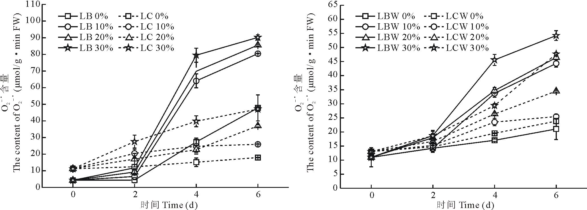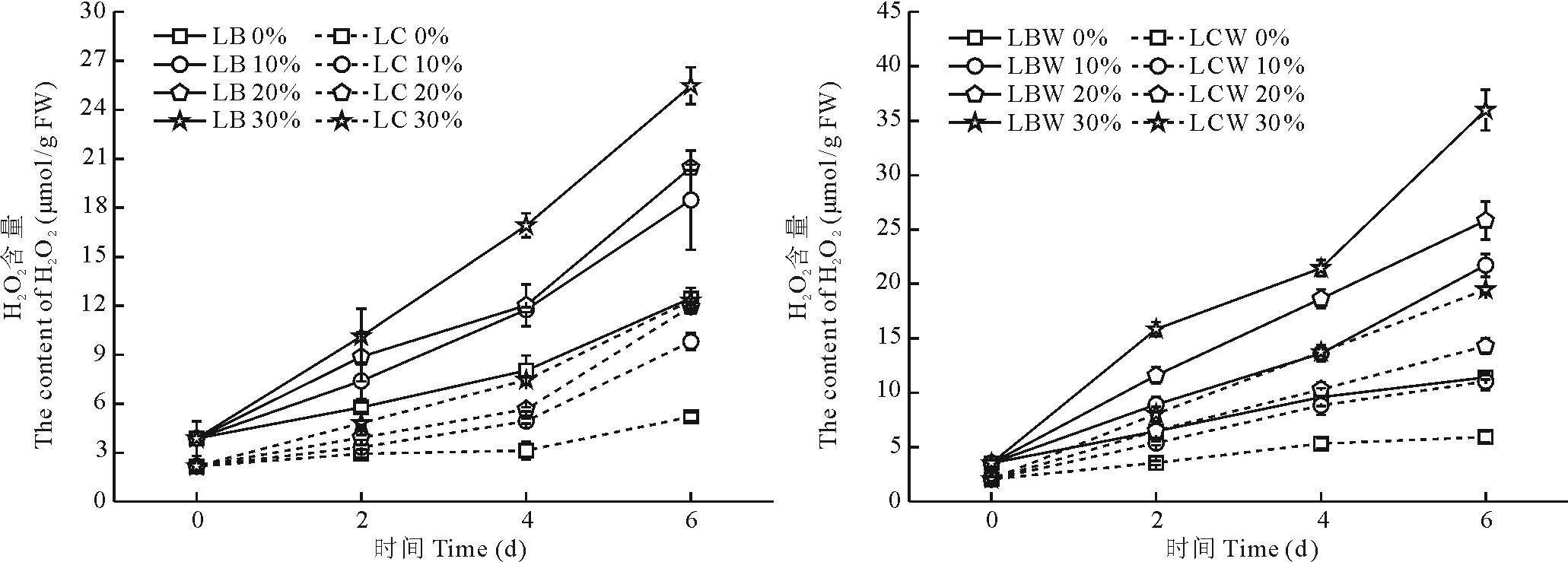 在植物体内的H2O2主要产生于线粒体、叶绿体和过氧化物酶体中, 线粒体中约1%5%氧被用于产生H2O2[7], 随着PEG-6000胁迫浓度的增加, 金心吊兰和野生型全绿吊兰的H2O2含量也逐渐增加, 且随着胁迫时间的增加, H2O2含量随之而上升(图2)。金心吊兰和野生型全绿吊兰的边缘部分H2O2含量总是高于各自的中心部分, 都在第6天达到最高含量。在30%浓度胁迫下, 随着胁迫时间的延长, 野生型全绿吊兰边缘部分H2O2含量增幅最大, 达到90.2%。而金心吊兰黄白色部分变化幅度较小, 仅发生小幅变化。