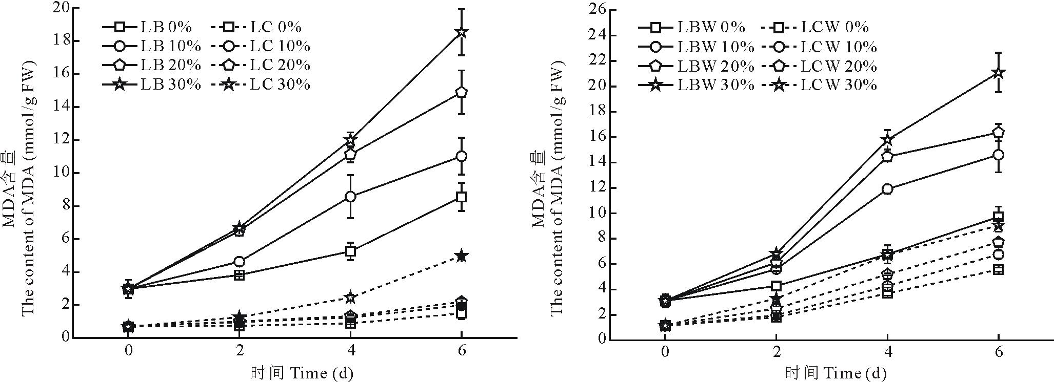 实验材料选自四川农业大学校园绿化带内栽培的金心吊兰及其野生型全绿吊兰, 分别于2012年5月10日采集后, 去掉泥土和腐烂的老叶, 栽培于灭菌后的石英砂上, 置于人工气候箱中(20℃, 12 h光照/12 h黑暗, 相对湿度60%), 定时浇灌完全Hoagland培养液。生长至6月25日, 选取长势一致的苗株各12株, 分别给予10%, 20%, 30%浓度的PEG-6000处理, 以不加PEG-6000为对照。处理0, 2, 4, 6 d后, 采集其从顶端往下第4片成熟叶中段测定生理指标, 各处理取样3次重复, 指标测定时各样品重复测定3次。