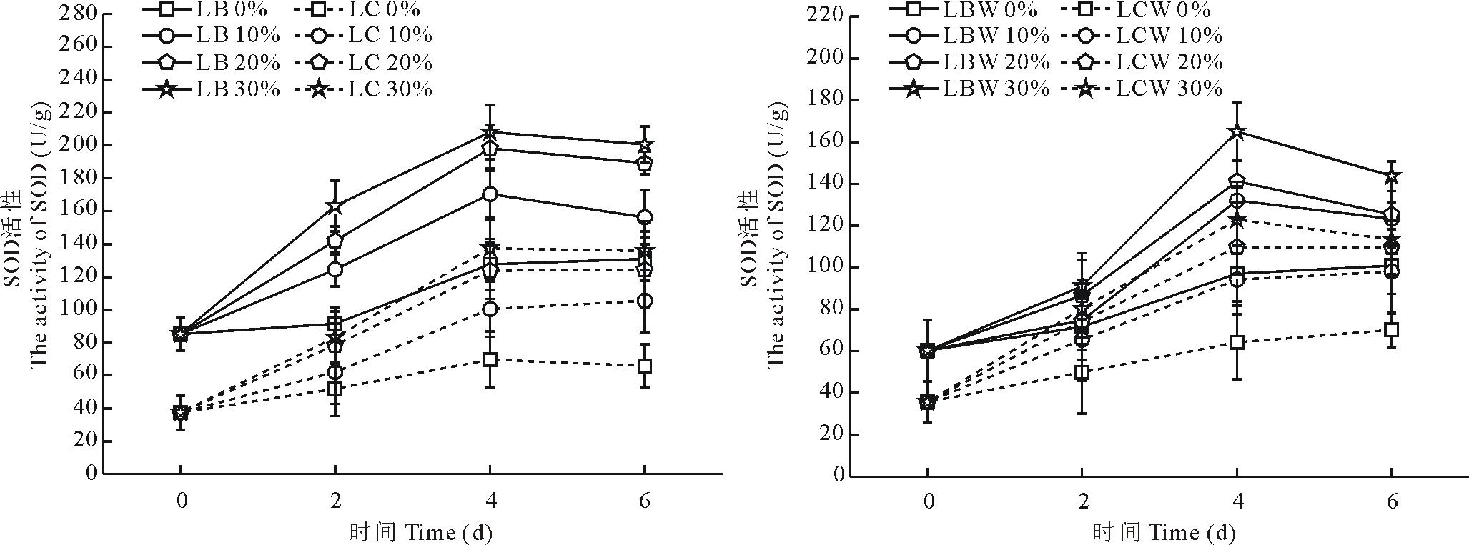 不同浓度PEG-6000胁迫后, SOD活性曲线显示(图5), 随着胁迫时间的增加, 金心吊兰与野生型全绿吊兰的SOD活性都出现了先上升后下降的趋势, 在第4天达到最大值。金心吊兰和野生型全绿吊兰的边缘部分的SOD活性高于中心部分(P< 0.05)。金心吊兰边缘部分在10%, 20%和30%胁迫下SOD活性增幅分别为45.5%, 54.9%和57.5%。而金心吊兰黄白色部分增幅稍大于其边缘部分, 分别为64.6%, 69.9%和72.5%。在野生型全绿吊兰边缘部分的SOD活性增幅也小于中心部分。