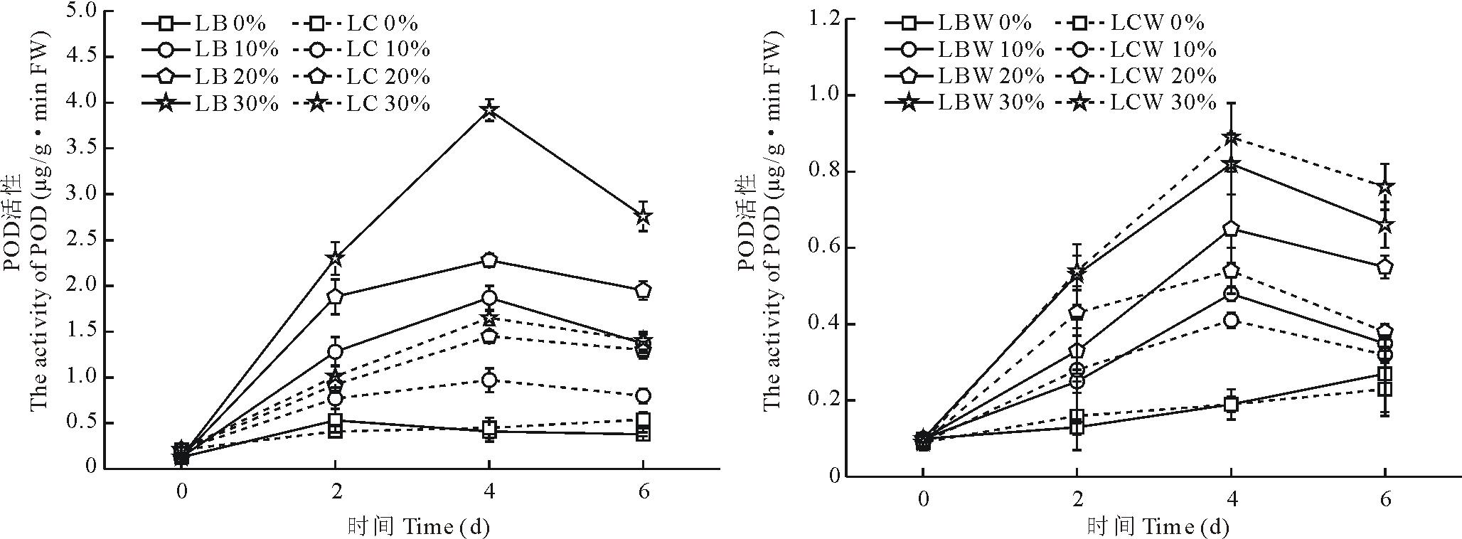不同浓度PEG-6000胁迫后, POD活性变化趋势显示(图6), 金心吊蓝绿色部分的POD活性显著高于中心黄白色部分(P< 0.05)。随着胁迫时间的增加, 金心吊蓝绿色部分与中心黄白色部分的POD活性先上升后下降的趋势, 都在第4天达到最大值, 分别是各自胁迫处理前POD活性的14.4, 17.5, 30.2倍和4.6, 6.9, 7.9倍。野生型全绿吊兰边缘部分与中心部分也呈现出先上升后下降的趋势, 在开始胁迫时候中心部分的POD活性高于边缘部分, 第4天时, 在30%胁迫浓度下, 野生型全绿吊兰边缘部分POD活性小于中心部分。这可能是在胁迫初期, 金心吊兰体内产生了过量的活性氧自由基