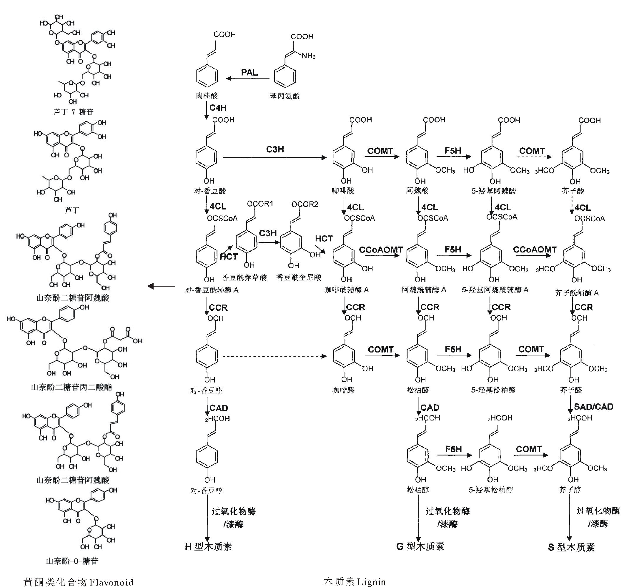 | 图1 苯丙烷和木质素单体生物合成途径, 重点显示了木质素单体的合成途径[3, 4]Fig.1 Phenylpropanoid and monolignol biosynthetic pathways mainly showing biosynthesis pathways of monolignols |