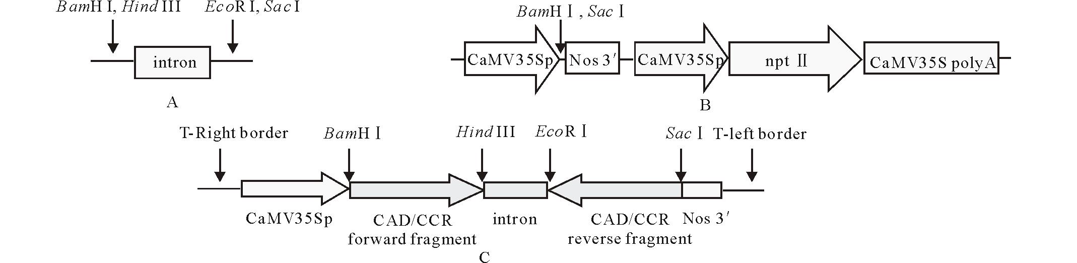 含有正向目的片段的重组pMD19-T载体分别经BamH I和Hind III双酶切, 分别回收小片段, 与经相同酶切的中间载体pSK-int连接, 筛选重组子并酶切验证。再将含CAD或CCR反向片段的重组pMD19-T载体分别用EcoR I和Sac I双酶切后, 回收小片段分别插入已经含有CAD或CCR正向片段的重组中间载体相应位点, 筛选重组子, 酶切验证。分别获得含有干扰片段的中间载体pSK-iCAD和pSK-iCCR, 具有发卡结构的干扰片段分别称为iCAD和iCCR。
