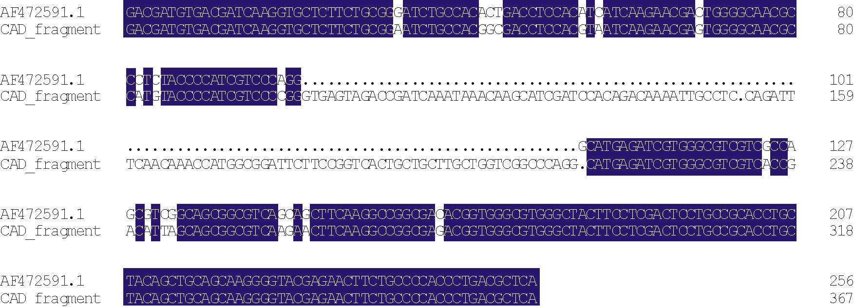 | 图3 CAD片段同源性分析 (102212为内含子)Fig.3 The sequence alignment of CAD fragment (102— 212 indicate the intron) |