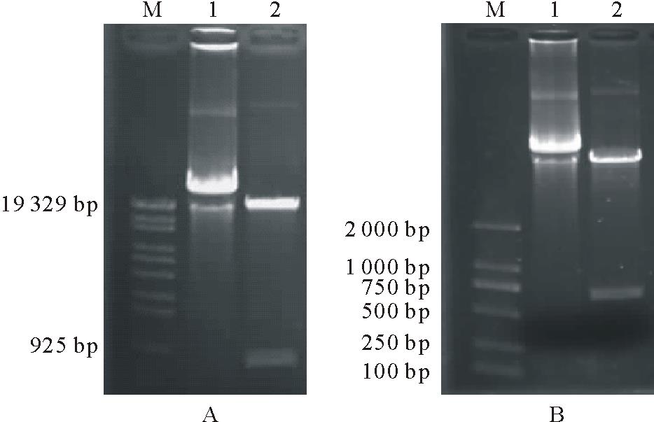 获得的目的片段分别以正反方向插入到载体pSK-int质粒内含子两侧, 构建了重组中间载体pSK-iCAD和pSK-iCCR。用BamH I/Sac I分别双酶切pSK-iCAD和pSK-iCCR, 回收目的片段iCAD和iCCR, 分别插入相同酶切的p2355载体相应位点, 构建了含干扰片段的植物表达载体p23-iCAD和p23-iCCR。iCAD片段长909 bp(正向片段373 bp、内含子163 bp、反向片段373 bp, 其中包含酶切位点12 bp), iCCR片段为767 bp(正向片段302 bp、内含子163 bp、反向片段302 bp, 其中包含酶切位点12 bp), 由CaMV35S启动子驱动。
