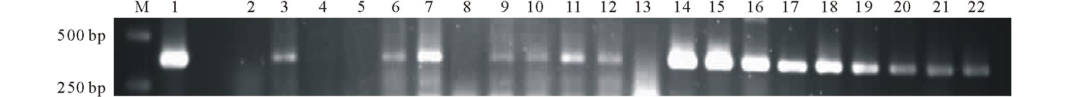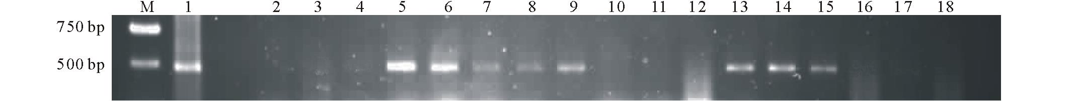 利用抗性植株叶片总DNA作为模板进行PCR验证, 由于CAD和CCR克隆片段分别比预期多出111和102 bp内含子序列, 因此扩增片段亦比预期分别长111和102 bp。扩增CAD 基因正向目的片段的引物为上游CaMV35S启动子引物55-1和cad-2, 片段长度约为500 bp(图7); 扩增CCR基因正向目的片段的引物为上游CaMV35S启动子引物355-1和ccr-2, 片段长度约为400 bp(图8)。