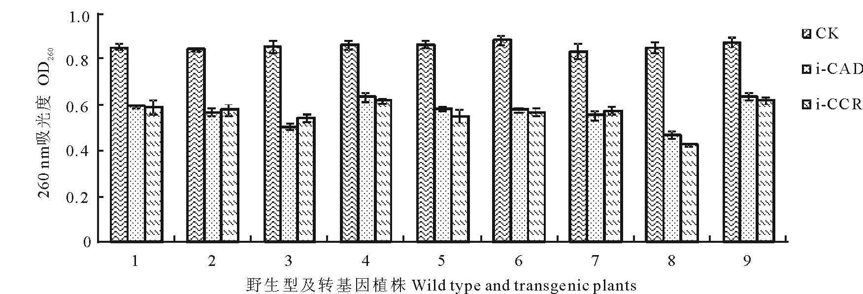 根据PCR验证结果, 分别对PCR阳性植株和野生型对照进行相对木质素含量测定。目前对i-CAD阳性和i-CCR阳性各测定了20个独立的转基因植株。提取叶片木质素, 在260 nm测定吸光度(图9)。由于木质素含量与吸光度呈正相关, 因此以野生型的吸光度作为对照, 转基因植株的吸光度与之相比较, 测定相对木质素含量。结果显示, 其中, i-CAD植株有11株、i-CCR植株有9株木质素含量明显降低。图9分别显示了9个木质素含量降低的植株。