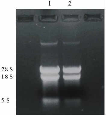 利用TRIzol一步法RNA提取试剂盒提取盐胁迫下的拟南芥叶片总RNA, 琼脂糖凝胶电泳显示, 总RNA 5S、18S和28S三条带清晰、完整(图1), 说明RNA完整性良好。利用RT-PCR试剂盒进行cDNA第1链合成后, 利用1对特异性引物及PyrobestTMDNA聚合酶, 以cDNA为模板进行目的基因扩增, 期望获得约1521 bp大小的DNA片段。对扩增产物电泳检查结果表明, 扩增产物与预期片段的大小基本一致(图2), 说明可能获得了AtHKT1基因的cDNA克隆。