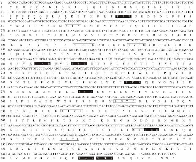 以NaCl胁迫处理的拟南芥幼苗叶片为材料,用RNA提取试剂盒抽提总RNA,通过RT-PCR技术和DNA序列测定分析,证实获得了拟南芥高亲和性K+载体蛋白基因( AtHKT1)的cDNA序列。该cDNA全长1521 bp,包括506个氨基酸和1个终止密码子序列,且与原序列(accession number AF237672)同源性为99.34%,但与其他科植物 HKT1基因同源性较低,注册该基因到GenBank中,注册号为AY685182。利用生物信息学相关软件分析预测 AtHKT1基因蛋白质功能和结构,结果发现,该蛋白分子量为57.45 kD,理论等电点为9.33;氨基酸序列中第1~40个氨基酸属信号肽序列;第152~500个氨基酸属Trk H阳离子转运体蛋白保守结构域,并存在蛋白激酶C,酪氨酸蛋白激酶,依赖cAMP/cGMP蛋白激酶磷酸化,糖基化和豆蔻酰化等功能位点;该基因编码的蛋白有10个跨膜结构,N末端、C末端及中部等多个跨膜区具疏水性,符合载体类运输蛋白特点。表明本研究获得了拟南芥 AtHKT1基因。