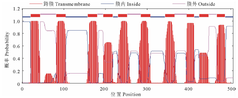 2.3.4 蛋白跨膜性及疏水性分析 经TMHMM Serverv 2.0软件分析推测, AtHKT1 蛋白有10个跨膜区(21~43, 82~104, 158~180, 195~217, 230~252, 285~307, 343~365, 395~412, 425~447, 467~486), 其中395~412区域的跨膜螺旋长度为18个氨基酸残基, 467~486区域的跨膜螺旋长度为20个氨基酸残基, 其余区域均为23个氨基酸残基(图8)。利用ProtScale软件的Kyte and Doolittle算法对AtHKT1蛋白进行亲水/疏水性分析(图9)。在347~359区域的疏水性最强(最大值达3.467), 疏水性较强的区域有13个, 分别位于第22~39, 58~68, 80~93, 157~164, 170~181, 199~206, 231~238, 245~256, 283~306, 326~328, 397~411, 430~434, 476~484个氨基酸处; 在372~390区域的亲水性最强(分值为-2.900), 其次有5个区域(45~52, 127~131, 139~141, 259~276, 415~422)具有较强的亲水性。就整体来看, 该蛋白疏水性氨基酸均匀分布在整个肽链中, 占总氨基酸组成的46.64%, 疏水区域大于亲水区域, N末端、C末端及中部等多个跨膜区均具有疏水性, 整个多肽链表现为疏水性, 可认为拟南芥AtHKT1蛋白是疏水性蛋白, 符合载体类运输蛋白特点, 表明获得了跨膜运输蛋白基因— — AtHKT1基因。