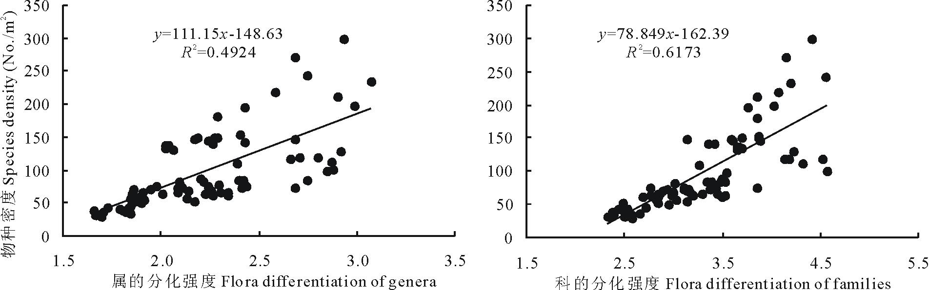 甘肃省野生维管植物物种密度和分化强度之间的相关性结果显示,属和科的分化强度均与其物种密度呈极显著正相关关系( P<0.01),其相关系数分别为0.702和0.781( 图4)。