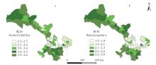 甘肃省野生维管植物科、属分化强度的地理分布格局与其物种丰富度的分布格局大致相同( 图3和 图2)。其中,科分化强度分布格局大致为处于多山地带东南部和河西南部的肃北、天水、阿克塞、文县、肃南、天祝、迭部、古浪、武都区等12县区最高,其值为3.9~4.6;与此相邻的漳县、崆峒区、礼县、安西、舟曲等20县区次之,其值为3.4~3.9;民勤、安定区、宕昌、凉州区,甘州区、玛曲县等19县区,其值处于3.0~3.4;永昌、康乐、西峰区、永登、环县、合水、华亭17县区值为2.7~3.0;白银市区、景泰县、会宁县等13县区最低,其值为2.3~2.7( 图3)。而属的分化强度分布格局与科的类似,亦为迭部、卓尼、文县、天祝、舟曲等16县最高,其值为2.6~3.1,徽县、安西、宕昌、两当、肃州区等16县区次之,其值处于2.3~2.6;礼县、金塔、临夏市、临泽,漳县等为2.1~2.3;清水、张家川、秦安、甘谷、宁县、永登,安定区等 15县区的为1.9~2.1;镇原、庆城、庄浪、泾川、崇信、临洮、静宁等19县区最低,其值为1.7~1.9。