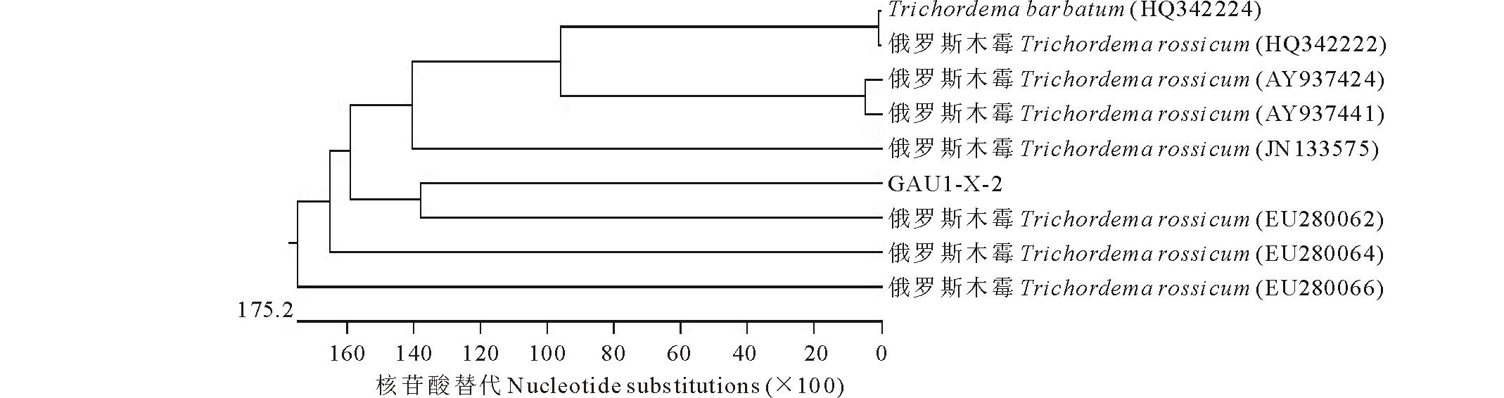 将测序得到的序列与GenBank核苷酸数据库中已有的木霉菌ITS 序列进行比对,菌株GAU1-X-2与GenBank上登录号为HQ342222( T. rossicum)、JN133575( T. rossicum)、HQ342224 ( T. barbatum)、AY937424( T. rossicum)的菌株同源性均达98%,与登录号为EU280062( T. rossicum)、EU280064( T. rossicum)、EU280066( T. rossicum)、AY937441( T. rossicum)的同源性达95%。