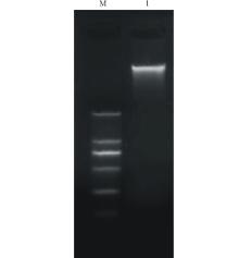 | 图2 菌株GAU1-X-2基因组DNA 凝胶电泳图Fig.2 The agarose gel electrophoresis of DNA of GAU1-X-2 M:分子量标准GM335 DNA Marker D;1: GAU1-X-2 基因组DNA Genomic DNA of GAU1-X-2. |
