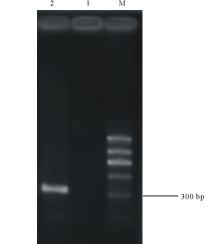 用CTAB法提取的菌株GAU1-X-2的基因组DNA用1%琼脂糖凝胶电泳检测DNA 质量,得到比较单一的条带,电泳条带明亮,带型较宽,DNA 含量较高( 图2)。经PCR扩增后得到大小为300 bp左右的片段( 图3),由上海生工测序后菌株GAU1-X-2得到了大小为301 bp的碱基序列。