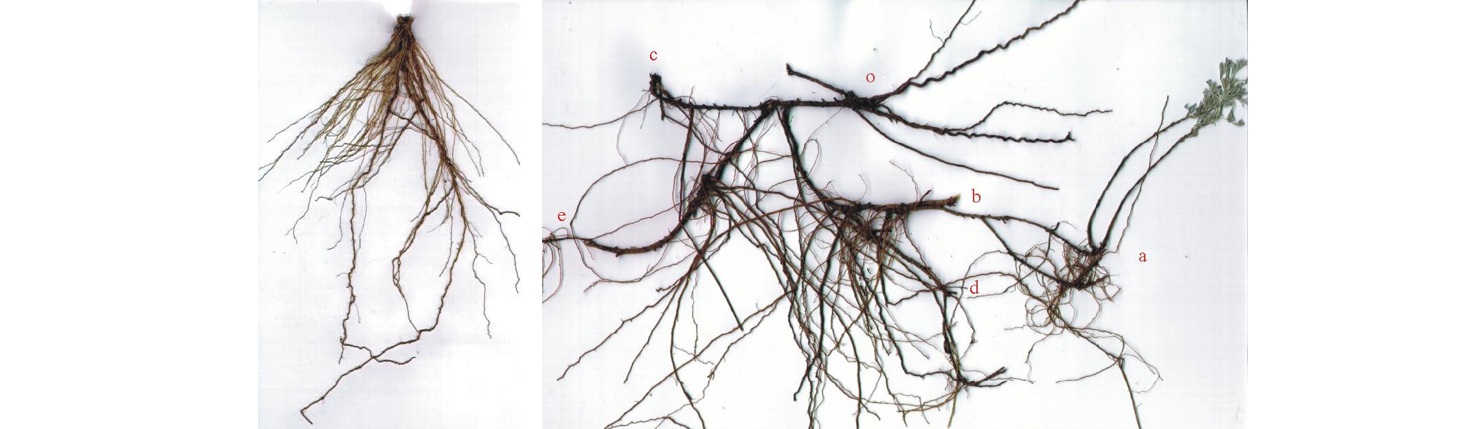 调查发现直立型冷蒿是由种子萌发的有性生殖产生,因此植株的根系类似于直根系( 图2左图),这种形态有利于冷蒿植株从更深的土壤层次中吸取水分以满足整个植物的生长发育所需。而匍匐型冷蒿的根系都有与其他植株相连的老枝条,形态如 图2右图所示,o点为冷蒿基株的基部,a~e分别为基株产生的分株处。随着时间的推移,各分株与基株脱离形成一个新的冷蒿植株个体。冷蒿枝条被沙埋后,在适宜环境下会生长出不定根进而在基株上形成不同大小的分株,从而形成了丛辐较大的匍匐型冷蒿个体。因此,匍匐型冷蒿个体比直立型冷蒿对地上空间利用的更充分,而直立型冷蒿个体则在土壤纵向的资源利用上占优势。
