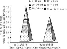 通过对冷蒿个体调查结果分析可知枝条密集生长的直立型有较高的地上生物量,直立型冷蒿植株有76.67%的单株生物量大于20 g,而匍匐型冷蒿中有50%。从构建的生物量金字塔( 图1)可以看出,在地上部分的高度及平均单株地上生物总量上,直立型冷蒿均优于匍匐型冷蒿。在0~10 cm即靠近植株基部,匍匐型冷蒿的生物量大于直立型冷蒿,而且基部的生物量大于10~50 cm以上部分的任一层。直立型冷蒿10~50 cm以上这5层的生物量大于匍匐型冷蒿,其株高达50 cm以上,但匍匐型冷蒿却在50 cm以内。以上结果可能与冷蒿的枝条木质化及匍匐型冷蒿生长得较低矮直接相关。