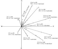 2009年的调查结果显示:在十多年的无干扰条件下,冷蒿种群无论在数量上还是规模上都远远超过了1998年。在冷蒿基株周围,扩散最远的冷蒿植株距离基株17.1 m,位于东偏南52°( 图4)。从整体上来看,冷蒿种群的扩散方向及分布情况与1998年调查结果类似,冷蒿植株主要分布在东北方向、东方,其次是东南方,西北方向和西南方向、西方冷蒿较少甚至没有冷蒿生长。而且在扩散距离上也是东北,东方和东南方的距离最远,西南、西北方向距离较近。