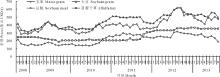 2008年9月-2013年8月,国际主要饲料价格最高为大豆,为313.700~619.410美元/t,平均为450.449美元/t,分别高于豆粕、玉米和苜蓿干草11.813%( P<0.01)、106.042%( P<0.01)和69.856%( P<0.01)( 图4)。国际玉米、大豆、豆粕价格波动上涨具有较为明显、一致的周期性,在2008年9月、2009年6月、2011年1-9月、2012年7-9月形成峰值,在2008年12月、2010年3-6月、2011年12月-2012年1月、2013年1-2月跌为谷值,周期约12~19个月;苜蓿干草价格较为平稳,只是在2011年下半年有明显跃升。在2012年受到美国、英国等发达国家大规模信用等级下降、美元贬值、气候变化等因素的影响,国际精饲料价格与往年相比价格上升幅度较大且周期较长,这在豆粕价格变化上尤为突出[ 2, 8]。