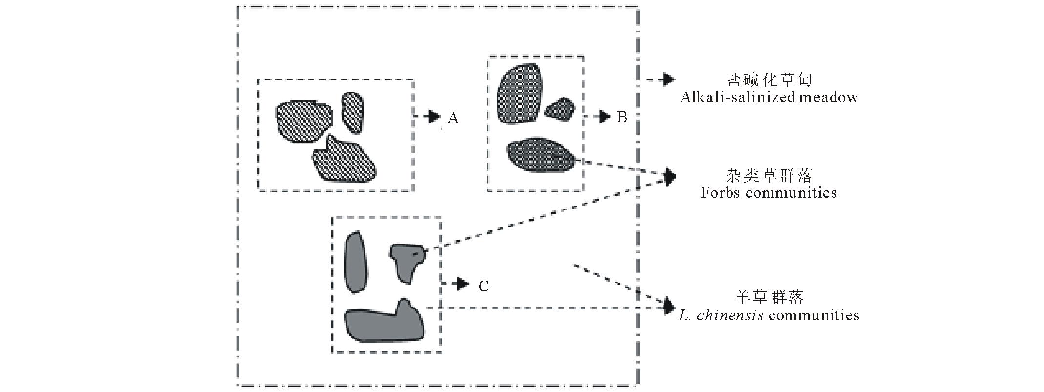 研究地点位于中国科学院长岭草地农牧生态研究站(44°33' N, 123°31' E, 海拔145 m),地处松嫩草地腹地。该区属于温带半湿润半干旱温带大陆性季风气候,春季干旱多风且降水稀少,地表蒸发剧烈;夏季降水集中,冬季降雪较少。年均温4.9℃,无霜期140~160 d。年降水量300~500 mm,集中在6-9月,占总降水量的70%。年蒸发量1600.2 mm,约是降水量的3.5倍。地带性土壤为黑钙土。主要植被类型为羊草草甸。以多年生根茎禾草羊草为优势的草甸中,镶嵌分布着一定数量的杂草群落聚集区,包括扁蓿豆( Medicago ruthenica)、兴安胡枝子( Lespedeza davurica)、细叶胡枝子( Lespedeza hedysaroides)、五脉山黧豆、野豌豆等在内的豆科植物以零散或聚集的方式生长在这些杂草群落区内。一种豆科植物往往集中分布于特定的杂草群落区(如 图1中A、B、C)。其中,五脉山黧豆和野豌豆是数量最多、分布最广的两种豆科植物。