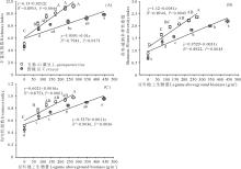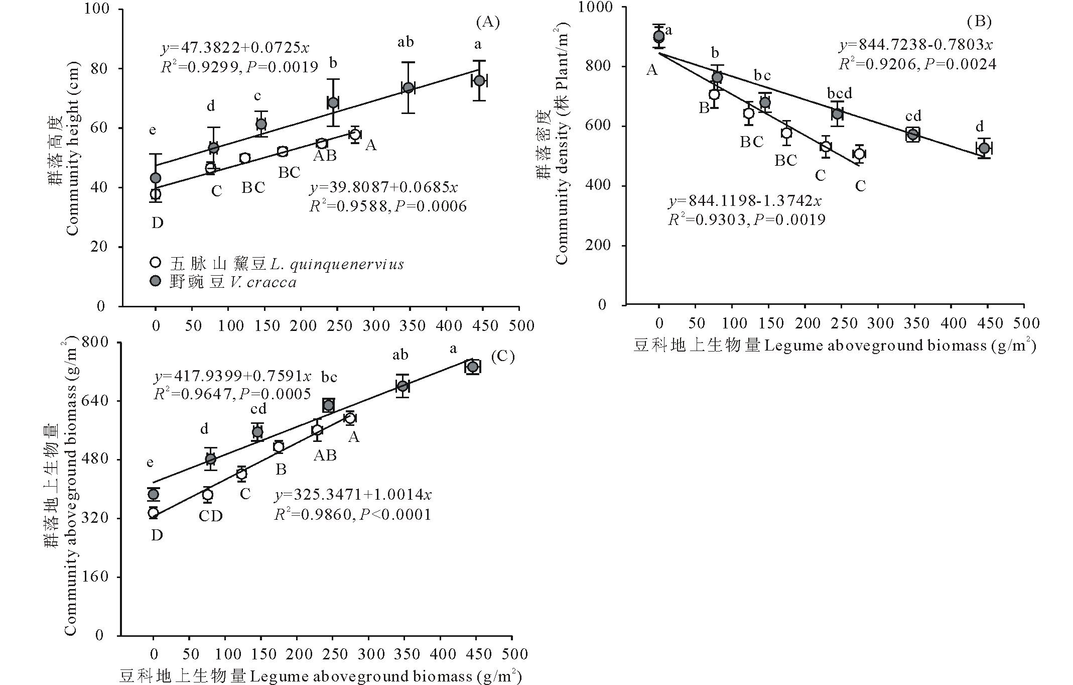 | 图2 豆科植物地上生物量与群落高度(A)、密度(B)、总地上生物量(C)的关系Fig.2 The relationships between legumes aboveground biomass and height(A), density(B), aboveground biomass(C) of community |
