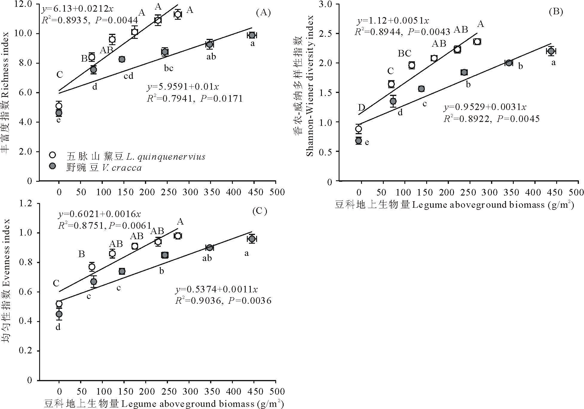 两类杂草群落区中,群落物种丰富度、多样性、均匀性和豆科植物地上生物量之间均有显著的线性正相关关系( P<0.05;相关系数及方程见 图3),并且三者均随群落中豆科地上生物量的递增而持续增加。五脉山黧豆地上生物量与三者关系斜率较野豌豆更大,表明3个变量随五脉山黧豆地上生物量增加的变化更快。同样的,按豆科植物地上生物量由低到高,不同五脉山黧豆地上生物量组对应的群落物种丰富度指数均值范围为5.08~11.27;Shannon-Wiener指数均值范围为0.88~2.36;均匀性指数均值范围为0.52~0.98。不同野豌豆地上生物量组对应的群落物种丰富度指数均值范围为4.63~9.89;Shannon-Wiener指数均值范围为0.68~2.20;均匀性指数均值范围为0.45~0.96( 图3)。与群落高度等相似,在相邻低豆科地上生物量组别间,群落物种丰富度、多样性、均匀性差异明显,尤其是无豆科植物组和相邻组间,均呈现显著性差异( P<0.05),而在高豆科地上生物量组间,这些指标的变化相对较小( 图3)。