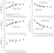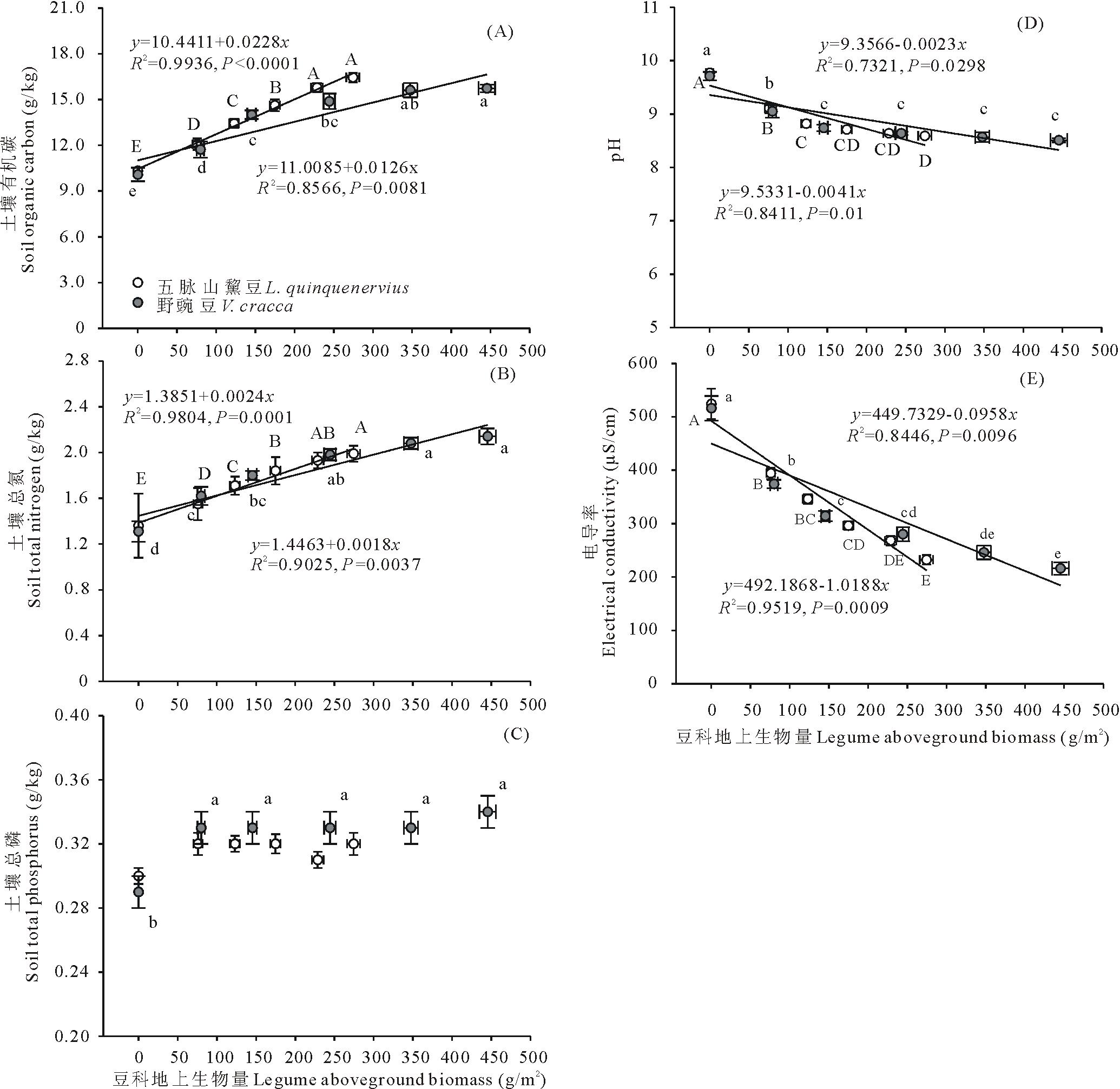 我们的研究结果发现, 土壤有机碳、总氮、土壤pH、电导率与豆科地上生物量存在显著相关关系。但土壤条件和豆科植物数量之间相互的决定关系却很难确定。因为自然生态系统中,土壤和植物存在相互作用,即土壤条件能够影响植物的定居,而定居的植物又将通过生命活动和物质循环途径反馈作用于土壤[ 26],尤其豆科植物,其对土壤条件可能有显著的改善作用。在盐碱化草地中,土壤盐碱程度是制约植物建植的首要因子[ 27, 28],土壤的高度盐碱化能通过抑制植物种子的萌发和幼苗的生长影响植物的建植[ 29]。然而,杨光[ 30]利用两种豆科植物在碱性盐胁迫下的发芽研究发现,即使土壤pH达到11.5以上,两种豆科植物种子的发芽率仍能达到83%以上,而在包括裸碱斑在内的整个松嫩草地,土壤的盐碱程度都要低于pH=11.5的水平[ 31]。因此,松嫩草地的土壤盐碱化状况可能不会、或至少不会单独构成两种豆科植物建植的限制因素。但考虑自然界中环境因子的协同变化,如在研究本区域内,表土盐碱化程度往往匹配着土壤干旱、养分贫瘠程度,因此并不排除盐碱胁迫协同其他因子共同限制两种豆科植物分布。豆科植物本身具有固氮的特性,因此土壤氮不可能成为限制豆科植物分布的因素,也未见有相关的报道。对于土壤磷水平,李强等[ 32]和宋彦涛[ 33]在本区域内的研究报道: 未退化羊草草地的土壤0~20 cm层总磷含量均低于0.20 g/kg,这个数值要低于本研究中杂草区的最低土壤磷含量,因此土壤磷可能是这两类豆科植物分布的限制因子之一。但对任意豆科植物分布区,在含豆科植物的各组样方中,土壤总磷含量并未表现显著差异,这可能意味着土壤磷对两种豆科植物的分布限制有个阈值,而超过这个阈值,土壤磷即不构成对两种豆科植物生长数量的限制。而根据我们的研究结果,如果磷确是两种豆科植物分布限制因子,这个阈值应该是有五脉山黧豆和野豌豆分布的最小土壤磷水平,分别是0.29和0.27 g/kg。综上,对本研究结果中土壤有机碳、总氮、土壤pH、电导率随两种豆科植物地上生物量增加的变化,可能有两个解释:1)尽管这些变量不会或至少不会单独构成限制两种豆科植物分布的因素,但它们附和了其他限制因子的变化而变化,譬如土壤水分或其他因子。但同时,两种豆科植物本身一定程度上也在改善土壤条件。因此,这些土壤因子在不同豆科植物数量的群落中的差异是土壤条件自身的变化和豆科植物改良土壤的共同作用结果;2)本区域内任一土壤因素均不构成对两种豆科植物分布的限制,两种豆科植物聚集程度的变化完全取决于其种子散布的随机性[ 34],而土壤性质的变化则源于不同数量豆科植物改良土壤作用的差异。尽管土壤性质与两种豆科植物生物量之间关系的机理还有待更深入的研究,但本文直观地给出了两者的对应关系,这对我们保护和发展这两种豆科植物提供了重要参考。4 结论 野外调查结果表明, 五脉山黧豆和野豌豆种群聚集程度主要在100~200 g/m2和100~300 g/m2 水平,五脉山黧豆和野豌豆的最小单位面积聚集量分别为51.73和61.19 g/m2,这可能是两种豆科植物在群落中维持个体生存和种群延续的最小单位面积地上生物量。群落高度、地上生物量、物种多样性随两种豆科植物地上生物量的增加而增加,这可能与两种豆科植物的性状和促进效应有关。五脉山黧豆存在下,群落物种替换和结构变化的速率更大。结合土壤数据,我们推定单位质量的五脉山黧豆较野豌豆对其他植物建植的促进作用更强。土壤有机碳、总氮、土壤pH、电导率与两种豆科植物地上生物量存在显著相关关系。而参考以往研究,我们得出这些土壤因子不会或至少不会单独构成对两种豆科植物分布的限制。磷可能是豆科植物分布的限制因子之一。因此,本研究中涉及的土壤因子随豆科植物数量的变化可能是协同了其他豆科植物分布限制因子的变化而出现的,或由豆科植物对土壤的改良作用决定的。