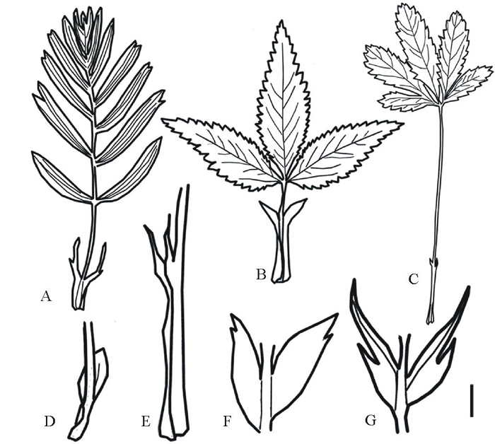 东北委陵菜属植物具有3种叶型(表3):三出复叶, 如蛇莓委陵菜和狼牙委陵菜(图1B); 掌状复叶, 如蔓委陵菜和蛇含委陵菜(图1C); 羽状复叶, 如鹅绒委陵菜和光叉叶委陵菜(图1A)。小叶边缘有锯齿(图1B)或有裂(图1A)。叶均具叶柄, 叶柄长度为3~10 cm。托叶通常为2枚, 位于叶柄基部的两侧, 如光叉叶委陵菜(图1A), 仅鹅绒委陵菜具1枚膜质的托叶(图1D)。托叶分为披针形, 如蛇含委陵菜及莓叶委陵菜等植物(图1E); 卵状披针形, 如三叶委陵菜和狼牙委陵菜(图1B); 卵圆形, 如红茎委陵菜(图1F)或呈叶状, 如伏委陵菜和灰白委陵菜(图1G)。