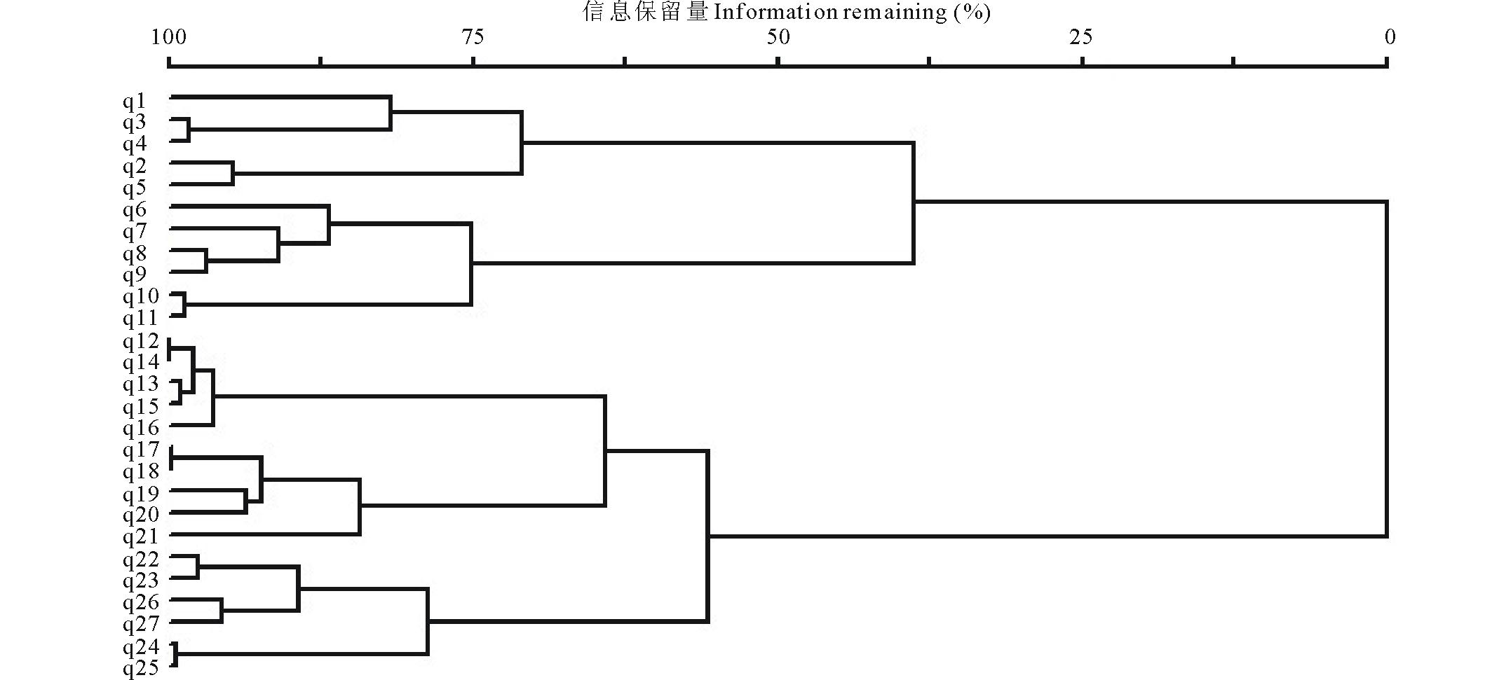 共调查270个样方隶属于27条样带, 记录种子植物58种。建立了两个矩阵:1)由27条样带58种植物的重要值组成的植被矩阵; 2)由27条样带15个环境参数组成的环境属性矩阵, 应用PCORD 5.0程序进行数量分类和排序。