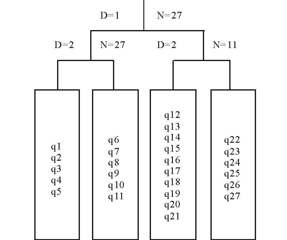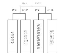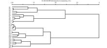 对植被矩阵采用可变类平均法和Euclidean Distance距离公式进行聚类, 结果如图1所示, 在信息保留量55%处, 27条样带可归入4个组, 代表对应的4个群丛类型。用TWINSPAN对该矩阵进行等级分划, 二级分划的结果和等级聚类的结果一致, 27条样带也可以分为4个组(图2)。因此将研究区的紫花针茅草原群落划分为4个组, 代表4个对应的有生态意义的群丛类型。