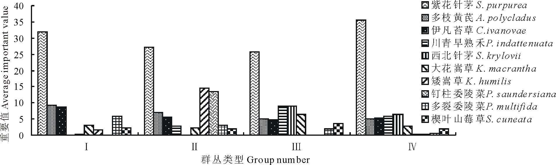 数量分类划分的4个群丛, 均是紫花针茅占据绝对优势地位的群丛, 但各群丛结构还是存在差异。从上面各群丛的描述可以看出群落总盖度和紫花针茅的相对盖度不同。从4个群丛主要种的重要值变化情况(图3)来看, 样地5群丛Ⅳ 中紫花针茅重要值在4个群丛中最大, 包含样地3和样地4的群丛Ⅲ 中紫花针茅重要值在4个群丛中最小, 但这两个群丛其主要种的重要值比例比较接近。在聚类分析中群丛Ⅳ 和Ⅲ 聚到了一起后才与天峻地区的两个群丛聚合。群丛Ⅱ 中矮嵩草和钉柱委陵菜的重要值比其他群落明显高出很多, 说明该群落有一定的湿润草甸性质。