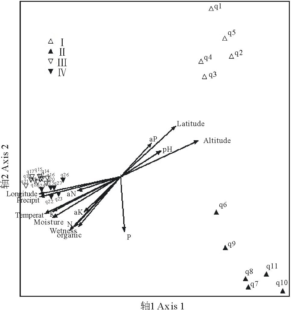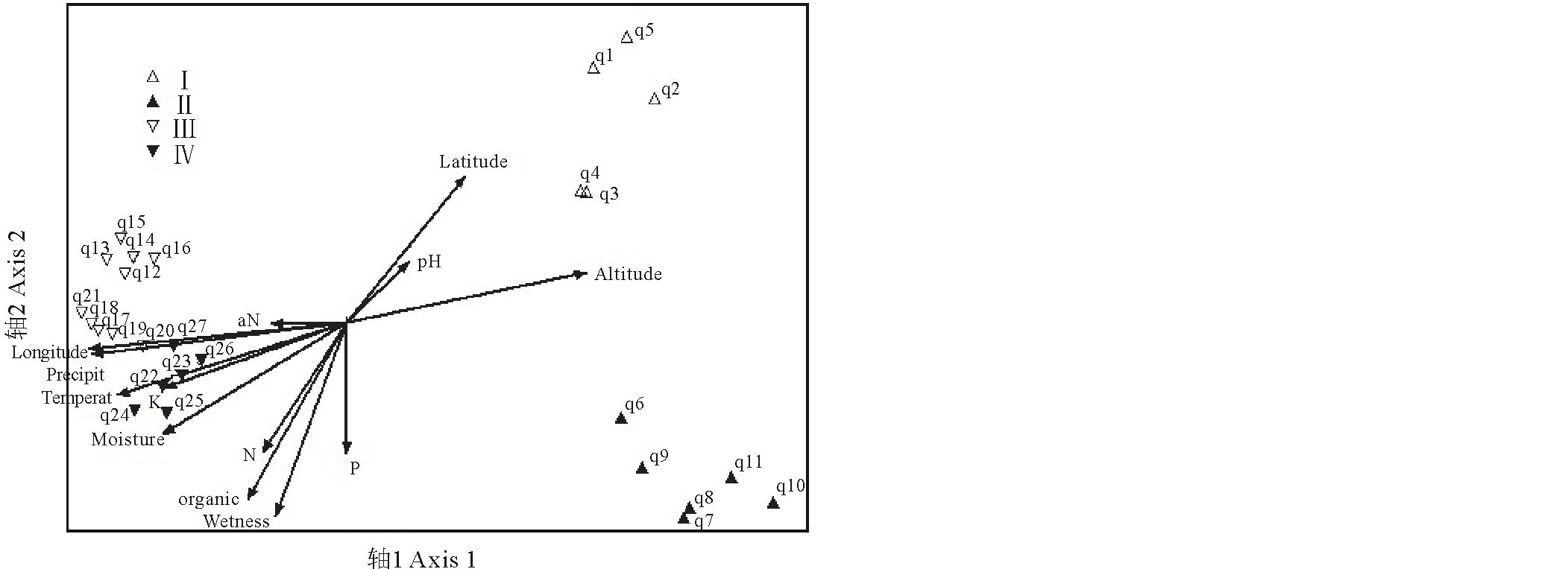样带及环境因子的DCA和CCA排序结果反映了一致的规律。两种排序方法第1轴和第2轴的特征值都远高于第3轴(表4), 反映了绝大部分的变量信息。排序第1轴和经度、年均降雨量、海拔、年均温相关系数高, 主要反映了空间和气候因子的变化。第2轴和年均湿润度、土壤有机质, 纬度、土壤全氮磷含量、土壤水分相关系数较高, 主要反映了水分和土壤因子的变化。土壤速效磷、速效钾等与各排序轴相关性都很小。数量分类的4个群丛在DCA和CCA排序二维空间均被分开(图4, 5), 进一步证明了数量分类的合理性。排序第1轴很好的指示了群丛Ⅰ 、Ⅱ 和群丛Ⅲ 、Ⅳ 的区别。沿着第一排序轴从左向右, 经度逐渐变小, 降雨量减少, 海拔升高, 温度降低, 群丛类型从东部刚察县低海拔典型草原群丛Ⅲ 和Ⅳ 过渡到西部天峻县高海拔草甸化草原群丛Ⅰ 和Ⅱ 。沿着DCA第2排序轴从下到上, 湿润度逐渐减小, 土壤养分减少, 纬度增大, 群丛类型从分布在较湿润肥沃环境的茂密群丛Ⅱ 过渡到分布在较干旱贫瘠环境的稀疏群丛Ⅰ 。群丛Ⅲ 、Ⅳ 的区分相对不明显, 但仍然可以看出群丛Ⅲ 的湿润度和土壤营养元素低于群丛Ⅳ 。