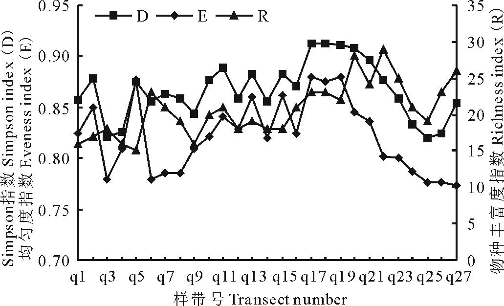 图6显示了研究区紫花针茅草原27条样带的Simpson指数(D)、均匀度指数(E)和物种丰富度指数(R)的变化曲线。总体来看, Simpson指数(D)和均匀度指数(E)的变化规律较相似, 物种丰富度指数和前两者相比波动较大。各群丛多样性平均值比较来看(表5), 均匀度指数变化趋势为群落Ⅲ > 群丛Ⅰ > 群丛Ⅱ > 群丛Ⅳ , Simpson指数的变化趋势为群落Ⅲ > 群丛Ⅱ > 群丛Ⅰ > 群丛Ⅳ 。群丛Ⅲ 均匀度指数和Simpson指数在各群丛中都是最高的。