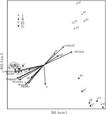 排序结果显示影响群丛分布的主要环境因子首先是空间和气候因子。鉴于青海湖北岸紫花针茅草原连续分布无显著地理隔离, 空间因子最终反映了温度和水分的变化, 例如随着海拔升高, 年均降雨量和年均温均下降等, 空间因子和气候因子在该研究区具有同维性。故最终影响紫花针茅草原群丛分布格局的主要环境因子归结为以年均降雨量和年均温为代表的气候因子。土壤因子对群丛分布的影响排在其次, 以土壤水分、有机质和全氮磷钾为代表。多枝黄芪和弱小火绒草分布于寒旱、高海拔区, 以多枝黄芪为次优势种的群丛Ⅰ 位于排序图右上端, 干旱、寒冷、海拔高, 和群丛分布区样地1的实际情况相符。群丛Ⅱ 和群丛Ⅰ 海拔都较高, 但群丛Ⅱ 以矮嵩草为次优势种, 伴生种中钉柱委陵菜和短穗兔儿草等湿润区分布的物种重要值大, 位于排序轴的右下端, 和分布区样地2较样地1降雨量大、湿润的实际情况相符。群丛Ⅲ 和群丛Ⅳ 都分布于刚察县, 气候环境相似, 伴生种相似, 在排序图中距离也较近。群丛Ⅲ 以川青早熟禾为次优势种, 总盖度低于群丛Ⅳ , 和排序图中左上端较干旱、土壤有机质少的位置相符合。本文中青海湖北岸紫花针茅草原群落27条样带通过两种数量分类方法划分为4个群丛类型, 各群丛类型在DCA和CCA排序图中也得到了较好的区分, 环境因子对群丛分布格局解释充分。