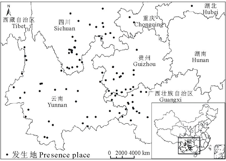本研究共收集全国紫茎泽兰发生地数据106个(图1), 其中部分来自于全球生物多样性信息交换所GBIF数据库(http://data.gbif.org/welcome.htm), 其他数据来源于已发表的文献及出版物[17, 18, 19, 20, 21, 22, 23, 24, 25, 26, 27, 28, 29, 30, 31, 32]。根据收集到的数据, 紫茎泽兰目前主要分布在云南、贵州、广西、四川等省, 西藏、湖北、台湾等地区也有零星分布。