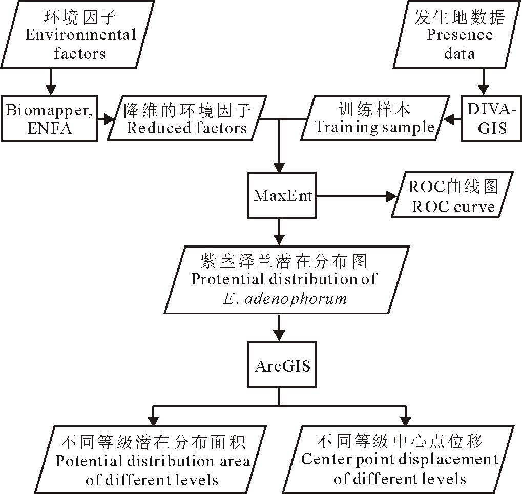 1.2.1 训练样本和测试样本选取 本研究的数据处理流程见图2。通过DIVA-GIS软件选取全部样点的75%作为训练样本, 其余样点和随机选取10倍于物种分布点的背景点共同作为测试样本。训练样本数据用于预测物种分布情况, 测试样本数据用于检验预测结果的可靠性。