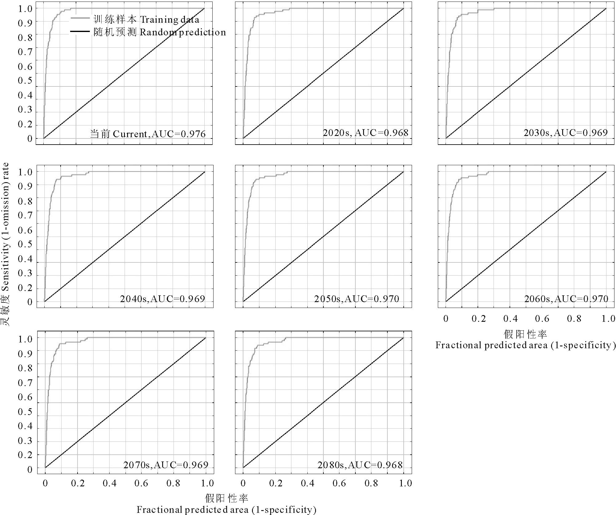 由图3可知, 通过MaxEnt模型得到的紫茎泽兰物种分布预测结果的AUC值都大于0.9, 预测结果很好, 对紫茎泽兰潜在分布区的预测较为可信。