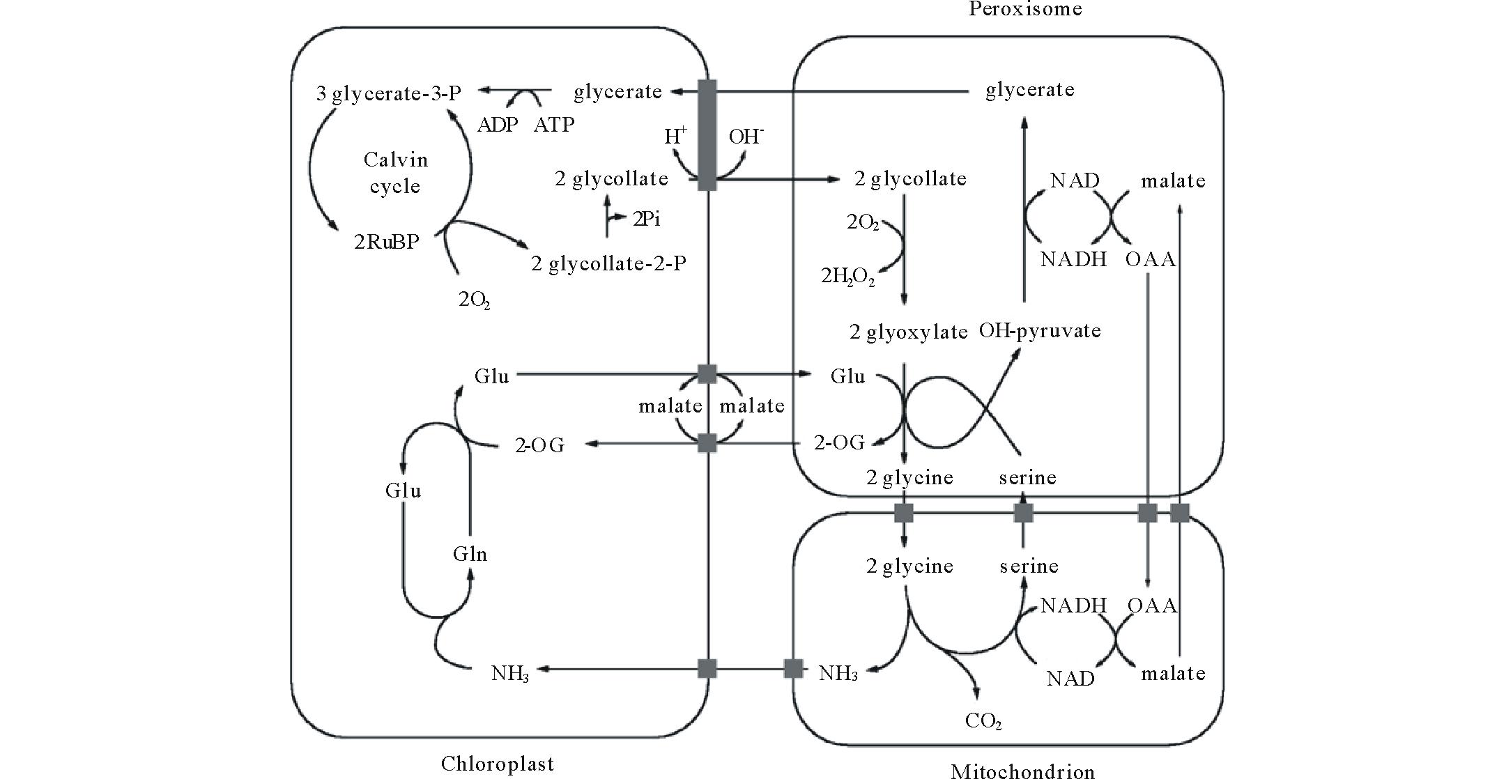 Chloroplast, 叶绿体; Mitochondrion, 线粒体; Peroxisome, 过氧化物酶体; glycerate, 甘油酸; glycollate, 乙醇酸; glyoxylate, 乙醛酸; glycine, 甘氨酸; serine, 丝氨酸; OH-pyruvate, 羟基丙酮酸; malate, 苹果酸; OAA, 草酰乙酸; 2-OG, 2-酮戊二酸(α -酮戊二酸); Glu, 谷氨酸; Gln, 谷氨酰胺。