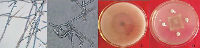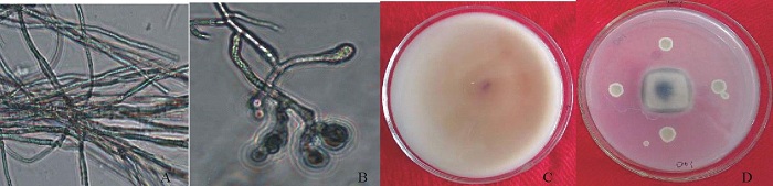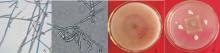 在被抑制的菌落边缘, 挑取少量靶标真菌基内菌丝, 镜检观察菌丝受抑制情况, 并进行显微照相。