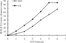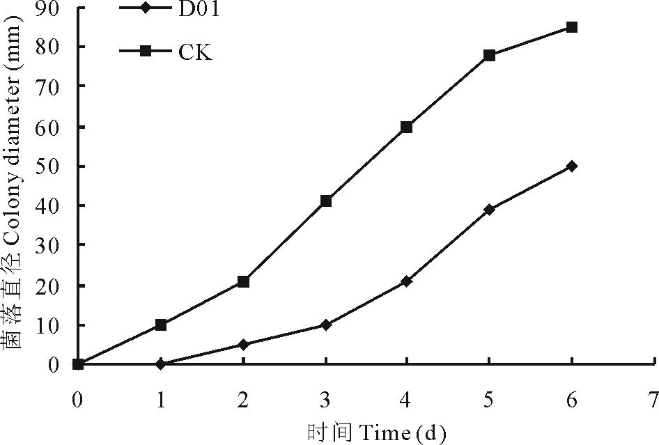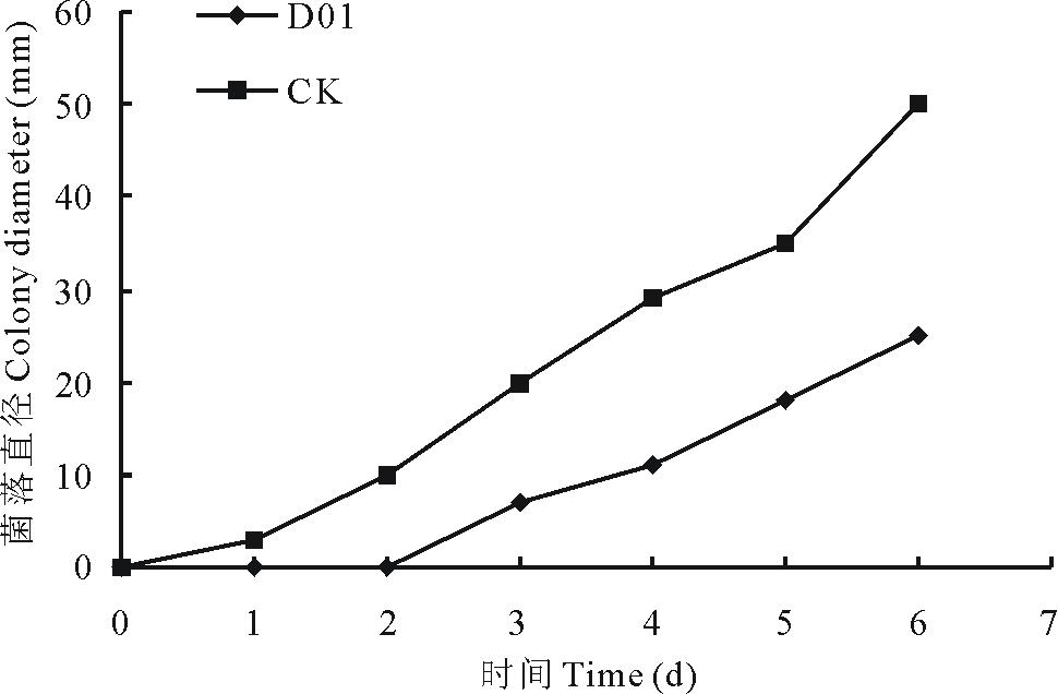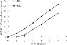 测定靶标真菌受抑制的菌丝能否恢复生长能力, 也就是放线菌对靶标真菌是否具有持续抑菌作用, 结果表明, 被抑制的马铃薯干腐病菌和马铃薯早疫病菌菌丝在正常条件下仍然可以恢复生长, 但生长速率缓慢, 菌落比对照稀疏, 日生长量远低于对照(图3, 图4); 马铃薯炭疽病菌受D01抑制后, 被抑制的菌丝在48 h后才缓慢恢复生长, 但生长量小, 且菌落颜色加深(图5); 马铃薯黑痣病菌受D01抑制后, 受抑制的菌丝在正常条件下生长明显缓慢, 24 h内生长量为零, 此后逐渐缓慢恢复生长(图6)。放线菌D01对马铃薯的4种病原真菌不同程度的表现了持续抑菌作用。