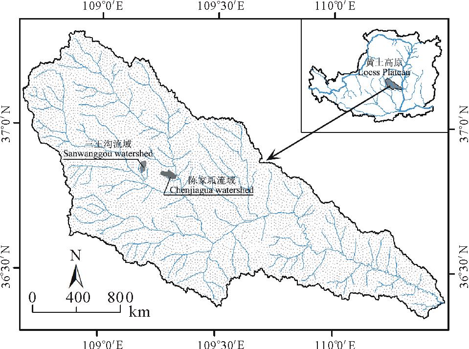 本研究选取了黄土丘陵沟壑区延河流域安塞县境内的2个小流域三王沟和陈家坬作为重复(图1)。研究区属温暖半干旱大陆性气候, 年平均气温8.8~10.2℃, 年日照时数2300~2400 h, 年平均降雨量520 mm左右, 6-9月降水量占年降水量的75%以上, 多以暴雨形式出现, 且局部雷暴雨发生频繁, 强度大[9]; 海拔1056~1443 m, 土壤类型以黄绵土为主; 天然草地、退耕草地、有林地和灌木林地共占流域面积的81%左右, 表现出森林草原带的基本特征。乔木主要为一些散生树种, 如小叶杨(Populus simonii)、榆树(Ulmus pumila)和杜梨(Pyrus betulifolia)等, 灌木多为森林带的一些优势种和次优势种, 如狼牙刺(Sophora davidii)、黄刺玫(Rosa xanthina)和紫丁香(Syringa oblata)等, 还有以铁杆蒿(Artemisia vestita)、茭蒿(Artemisia giraldii)、白羊草(Bothriochloa ischcemum)、长芒草(Stipa bungeana)和达乌里胡枝子(Lespedeza davurica)等优势种组成的草原植被[10]。