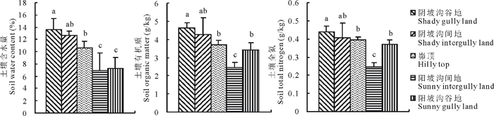 依据王力等[11]的土壤干层分级标准和全国第二次土壤普查养分分级标准[12], 由图3可知, 峁顶和阳坡土壤分别存在轻度和中度干层现象, 5种立地环境的土壤有机质和全氮均处于极缺乏状态。各立地环境由于地形和土壤侵蚀的差异, 造成光热和降水的再分配, 因而其光照、土壤水分和养分等生态因子也存在差异, 即光照在阳坡沟谷地强, 在阳坡沟间地和峁顶更强, 越过峁顶从阴坡沟间地到阴坡沟谷地逐渐变弱; 土壤含水量、有机质和全氮含量从阴坡沟谷地最高, 到阴坡沟间地越过峁顶到阳坡沟间地降到最低, 到阳坡沟谷地又呈升高趋势(图3)。 因此, 各生态因子对植物的综合胁迫程度应为阴坡沟谷地< 阴坡沟间地< 峁顶< 阳坡沟谷地< 阳坡沟间地。