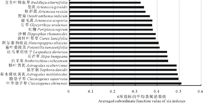 所有供试物种中, 禾本科植物中华隐子草的平均隶属函数值最大, 表明其抗氧化能力最强, 禾本科植物糙隐子草、白羊草和长芒草及豆科植物草木樨状黄芪、糙叶黄芪、达乌里胡枝子和狼牙刺的平均隶属函数值较大, 抗氧化能力较强, 其次为蔷薇科植物菊叶委陵菜、菊科植物阿尔泰狗娃花、莎草科植物披针叶苔草、胡颓子科植物沙棘和萝藦科植物杠柳, 而豆科植物甘草及菊科植物猪毛蒿、野菊、铁杆蒿和茭蒿的平均隶属函数值较小, 表明其抗氧化能力较弱, 马钱科灌木互生叶醉鱼草的平均隶属函数值最小, 抗氧化能力最弱(图4)。这几种豆科植物(除甘草外)的抗氧化能力较强也间接地反映了该研究区贫瘠的土壤养分状况, 因为豆科植物具有固氮耐瘠的生物学特性。