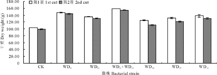 2.4.3 不同溶磷菌对甜高粱干重的影响 从图3可知, 接种菌株对甜高粱干重影响较大, 相比对照, 各处理在2茬中干重都高于对照。第1茬WD51、WD20与WD51+ WD20处理较对照分别增加27.67%, 17.77%和32.85%; 第2茬则分别增加44.37%, 31.56%和55.32%。可见, 溶磷菌对甜高粱干重影响明显。2种菌株复合作用, 也可以达到协同增效。WD29、WD37和WD14处理的甜高粱干重也显著高于对照, 但三者之间差异不显著。
