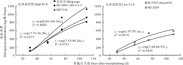 采用指数模型拟合氮素积累量与移栽后天数的关系, 其方程为: