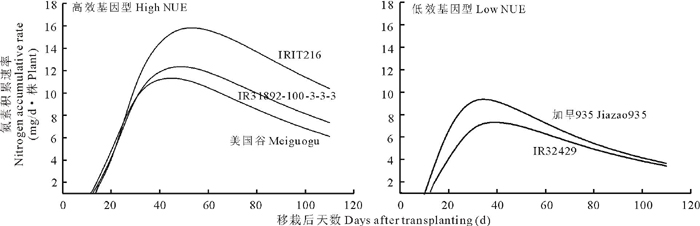 2.4.2 氮素最大积累速率及出现时间 两类基因型氮素最大积累速率均出现在移栽后30~50 d, 但具体时间有所不同, 且最大积累速率也存在明显差异。根据二阶导数法, 计算出了氮素最大积累速率以及出现的时间。由表4分析可知, 高效基因型美国谷、IR31892-100-3-3-3、IRIT216氮素最大积累速率分别为11.32, 12.36, 15.83 mg/(d· 株), 为低效基因型加早935的1.22, 1.33, 1.70倍, 为IR32429的1.56, 1.70, 2.18倍; 氮素最大积累速率分别出现在移栽后45, 48, 53 d, 即分蘖旺盛期, 而低效基因型加早935、IR32429氮素最大积累速率出现较早, 分别在34, 40 d, 即分蘖前期。