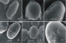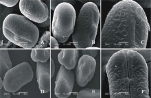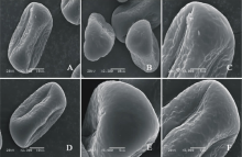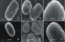 V. hyrcanica(图7DF)极轴长(20.40± 1.67) μ m, 赤道轴长(34.80± 1.48) μ m, P/E值为0.59。赤道面观为扁圆形, 极面观为三裂圆形。三孔萌发沟并延伸达两极, 萌发沟细窄。表面为网状纹饰, 明显。