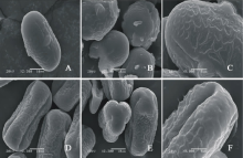 V. monantha(图5AC)极轴长(30.40± 2.07) μ m, 赤道轴长(16.00± 2.24) μ m, P/E值为1.90。赤道面观为椭圆形, 极面观为三裂圆形。三孔萌发沟并延伸达两极, 萌发沟细窄。表面为网状纹饰, 比较模糊。
