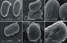 V. costata(图3DF)极轴长(17.80± 2.17) μ m, 赤道轴长(38.20± 0.84) μ m, P/E值为0.47。赤道面观为扁圆形, 极面观为三裂圆形。三孔萌发沟并延伸达两极, 萌发沟细窄。表面为脑状纹饰, 明显。